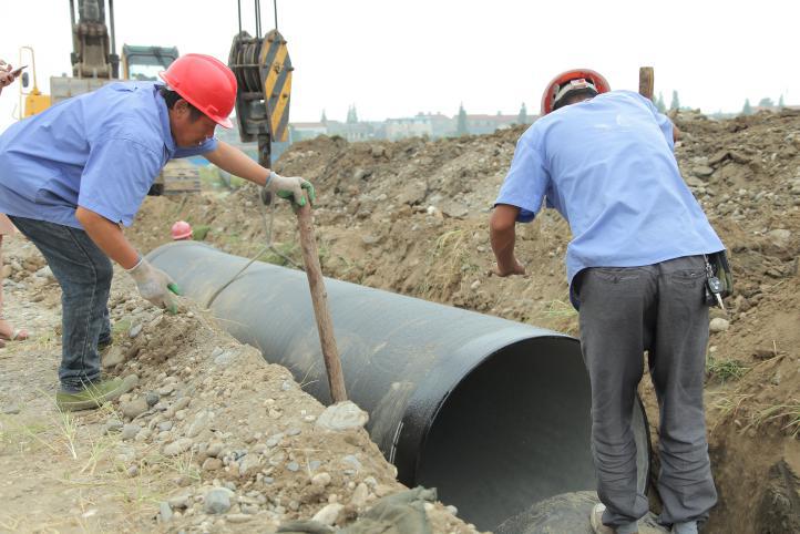 隨后,挖機(jī)將十幾噸重的一截管材吊起,管材緩緩離地,王俊也配合著用力推動(dòng),調(diào)整管材的方向。管材運(yùn)至管溝上方時(shí),王俊便拿著木棍,跟同事合力使勁撬動(dòng)管材。只見兩人牙關(guān)緊咬,管材每次卻只轉(zhuǎn)移了一點(diǎn)點(diǎn)角度,足足幾分鐘后,管材角度才被調(diào)成與管溝平行,順利地與上一截管道對(duì)接。
